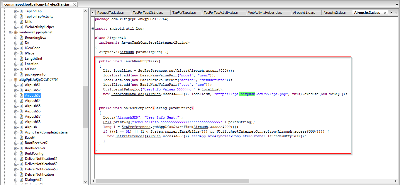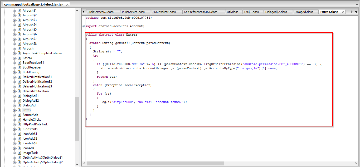 This app contains the Airpush and Revmob advertising SDKs. From the screenshot above, you can see the application harvesting the device MAC address (something Apple has cracked down on), mobile ID, Android ID and serial numbers. Adware harvests such information for tracking users as this information allows for tracking the user’s device across applications using the same SDKs.