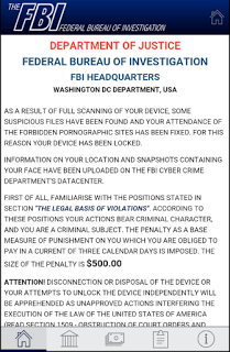 Once the user clicks on the "ACTIVATE" button, the malware gets administrator control of the device and locks it while displaying a fake FBI warning as seen below. It locks the user's phone by disabling keyguard and sets top priority for the malware application which ensures that no other application or user activity can override the malware application's activity.