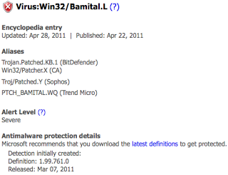 The other day I detected a handful of Bamital infected clients beaconing out with a different pattern than that listed in EmergingThreats, and thought I'd post something for the masses to consume and be on the lookout for in their networks. Microsoft's Malware Protection Center, lists a first iteration of the Trojan back in 2009 to do pop-up/injected advertising on behalf of the attacker ... but since then the malware family has grown in variations and scope of capability - for example, search result manipulation and malware dropping. There are now 29 variants listed in the MS encyclopedia, including those published in mid/late April 2011. For example,