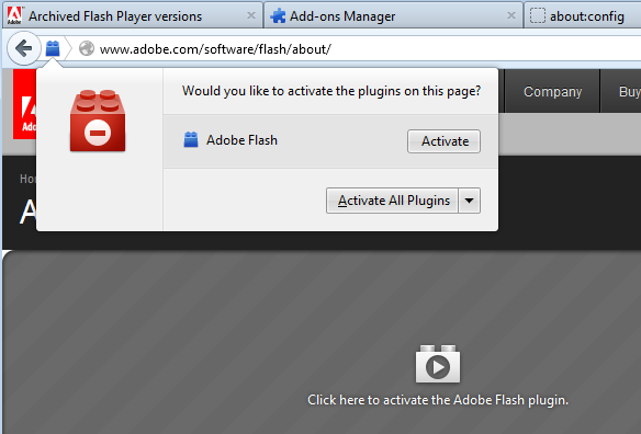 One of the problems in the previous implementation of Click to Play was that plugins could be used without any visual widget on the page, so no warning would be displayed to the user. In Firefox 17, there is an additional icon on the left of the URL bar that is visible when a plugin has been disabled on the page. You can click on the blue icon to choose what to do: enable the plugin once, always enable the plugin on the site, etc.