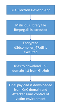 The impacted 3CX Electron Desktop App was bundled with an infected library file named ffmpeg.dll. This infected library further downloads another encrypted file d3dcompiler_47.dll. This file has functionality to access .ico files hosted on GitHub which contain CnC information. These CnC domains are used to deliver the final payload which allows the attacker to perform malicious activity in the victim’s environment. The diagram below shows the attack chain.