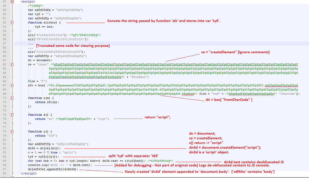 - Function ‘alz’ concatenates a string passed to it and assigns the concatenated string to the ‘ty6’ variable. This is later used by the de-obfuscation routine.