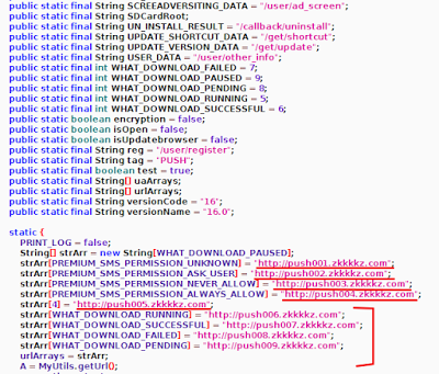The service started by this app continually sends requests to aforementioned URLs, some of which will deliver new APKs.