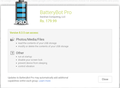 We also saw a spoofed version of BatteryBot Pro available for free during our research. The actual price of BatteryBotPro on official Play Store is Rs.179.99. The legit BatteryBotPro app demanded for minimal permissions as shown below: