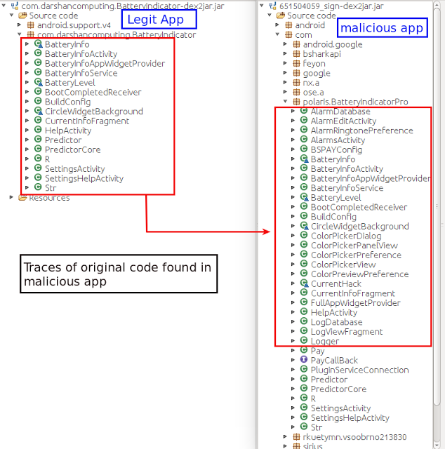 The screenshot below shows a comparison between the actual app and the fake app. The legit app functionality was modified and embedded at a different location within the fake app: