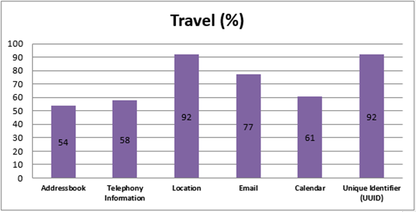 In the Travel category, we observed 54% of apps with access to the address book, 58% of apps have telephony data access, 92% of apps have access to location information, 77% of apps are using email and 61% of apps are using the calendar framework. Additionally, 92% of apps are leveraging UUIDs.