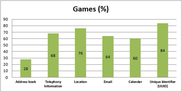 In the Entertainment category, we have observed 20% of apps trying to access address book functionality, 75% of apps are asking for telephony data, 86% of apps are using location APIs to track a user’s location, 88% of apps are using the Email framework and 70% of apps are using calendar data. Additionally, 97% of apps are using UUID’s for tracking.