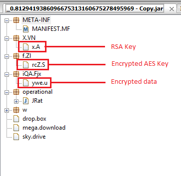 The JAR file dropped, as seen in the image below, is just a dropper and decrypter for the main jRAT file. It basically contains the jRAT sample in an encrypted form. The encryption of the file is done by an embedded AES key, which is again encrypted using an RSA key. The decrypter for this file has been written by hasherezade of MalwareBytes.