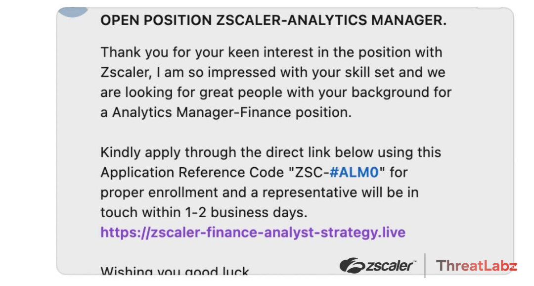 Fig 1 - Shows a LinkedIn message phishing for victims with a fake Zscaler job link and reference code