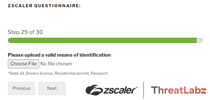 As a final step of the questionnaire, the victim is prompted to verify identification by uploading a copy of their State ID, Drivers License, Residential Permit, or Passport. Collecting this document along with the victim's other personal information may enable the scammers to impersonate the victim committing identity theft and fraud, or sell the information to other scammers.