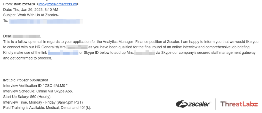 Note that the Skype invitation provided in the email shows a profile photo of an actual Zscaler recruiter.