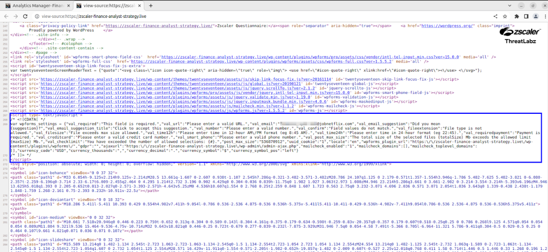 A script found in the site’s code contained an email address impersonating a Netflix recruiter with domain jobnetflix[.]com.