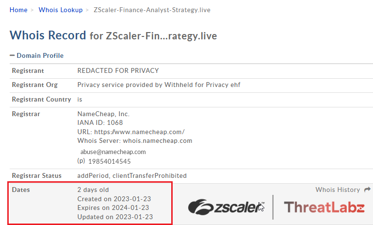 The malicious domain used in this scam - zscaler-finance-analyst-strategy[.]live, was created on 23-Jan-2022, a Newly Registered Domain at the time of technical analysis by Threatlabz researchers on 24-Jan-2022, following an observed attack one day after the domain was created.