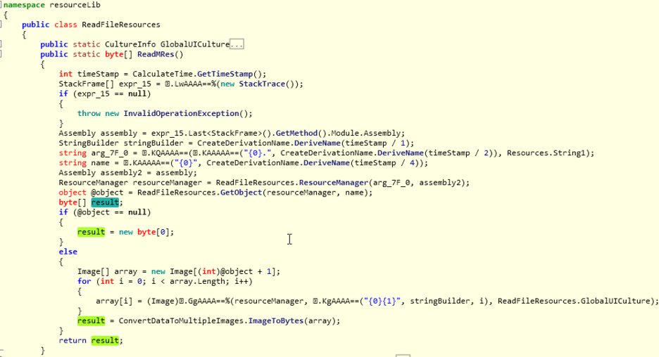 The main method inside this assembly is called ReadMRes() with the name "resourceLib," which extracts the relevant information from the bitmap images, as shown in Figure 13.