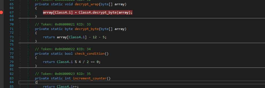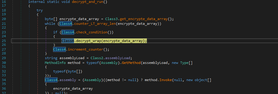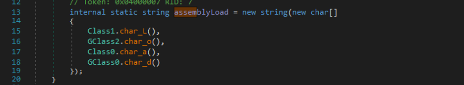 This was a similarity shared among all instances of packers used in the campaign where the “Load” string was split into individual characters and assembled at runtime. This could be done to bypass static analysis-based solutions that search for Assembly.Load() method in the decompiled code.