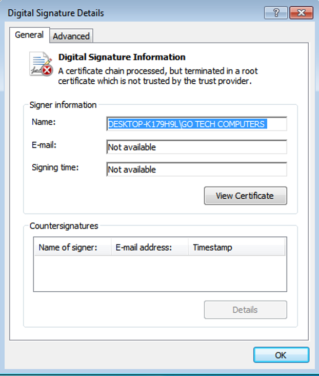 The unpacked final payload is signed with a certificate from “DESKTOP-K179H9L\GO TECH COMPUTER” as shown in Figure 19.
