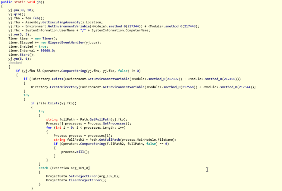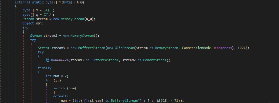 After gzip decompression, we obtain a .NET payload that is obfuscated using ConfuserEx. Once we deobfuscate the ConfuserEx protection, the main method of the final payload is shown in Figure 16.