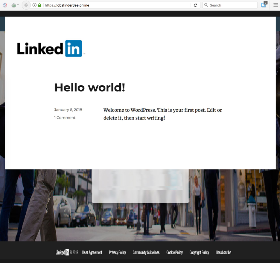 - In March 2018, a domain—jobsfinder3ee[.]online—was registered, which hosted a web page that spoofed LinkedIn on a WordPress site. We correlate the owner of that domain with a low confidence level to the campaign we discuss in this blog. The old webpage hosted at jobsfinder3ee[.]online is shown in Figure 4.