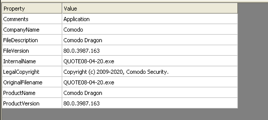This binary spoofs the metadata data of a legitimate Comodo security application, as shown in Figure 5.