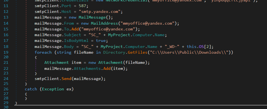 In addition to Agent Tesla, we also encountered another payload previously unseen in the wild. It is a very basic information stealer capable of stealing keylogs, clipboard data, and screenshots. It sends stolen data to an embedded yandex.com email address. All layers of the packer used in the sample are the same as the ones used in Agent Tesla samples.