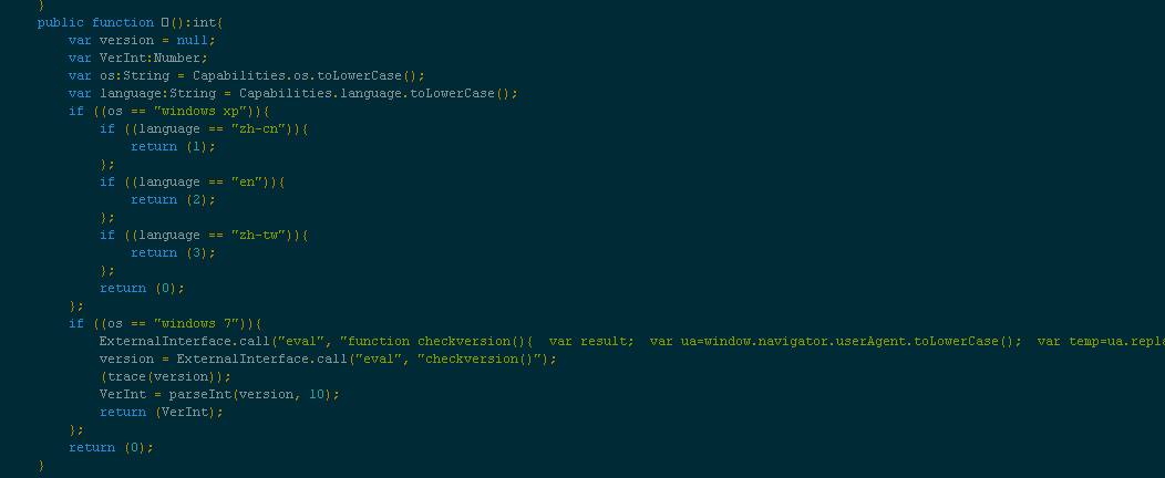 The script then checks the operating system version and in the case of Windows XP, further checks the OS language. Details of the OS language and version are then used to determine the base address for the exploit. In case of Windows 7, the script further probes for unpatched and outdated versions of Java (Web Start 1.6 and 1.7) or Microsoft Office (Sharepoint OpenDocuments 3 or 4).