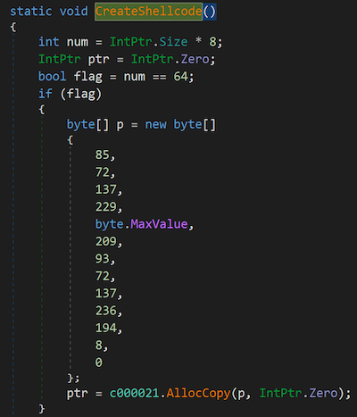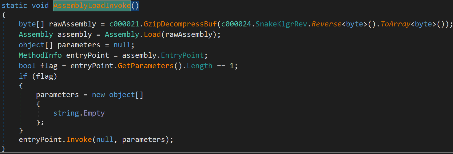 The first-stage then loads the assembly, retrieves the hardcoded name of a method to call and invokes it.