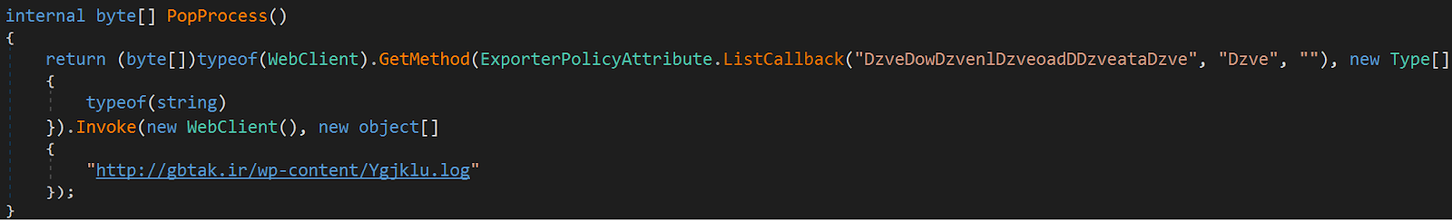 The application secretly downloads a .NET assembly from a command and control server in order to bypass security products. The bytes of the assembly are completely reversed and this same technique is used across PureCrypter’s different stages. The second-stage filename typically has a fake extension such as “jpg”, “png” or “log” and/or a legitimate-looking filename (e.g., “EpicGames.jpg”). The sample analyzed by ThreatLabz downloaded the second-stage from http://gbtak[.]ir/wp-content/Ygjklu.log (the SHA256 was 7bd6a945f1de0e390d2669c027549b49107bf116f8b064bf86b5e897794f46f9 after the bytes were reversed) as shown in Figure 3.