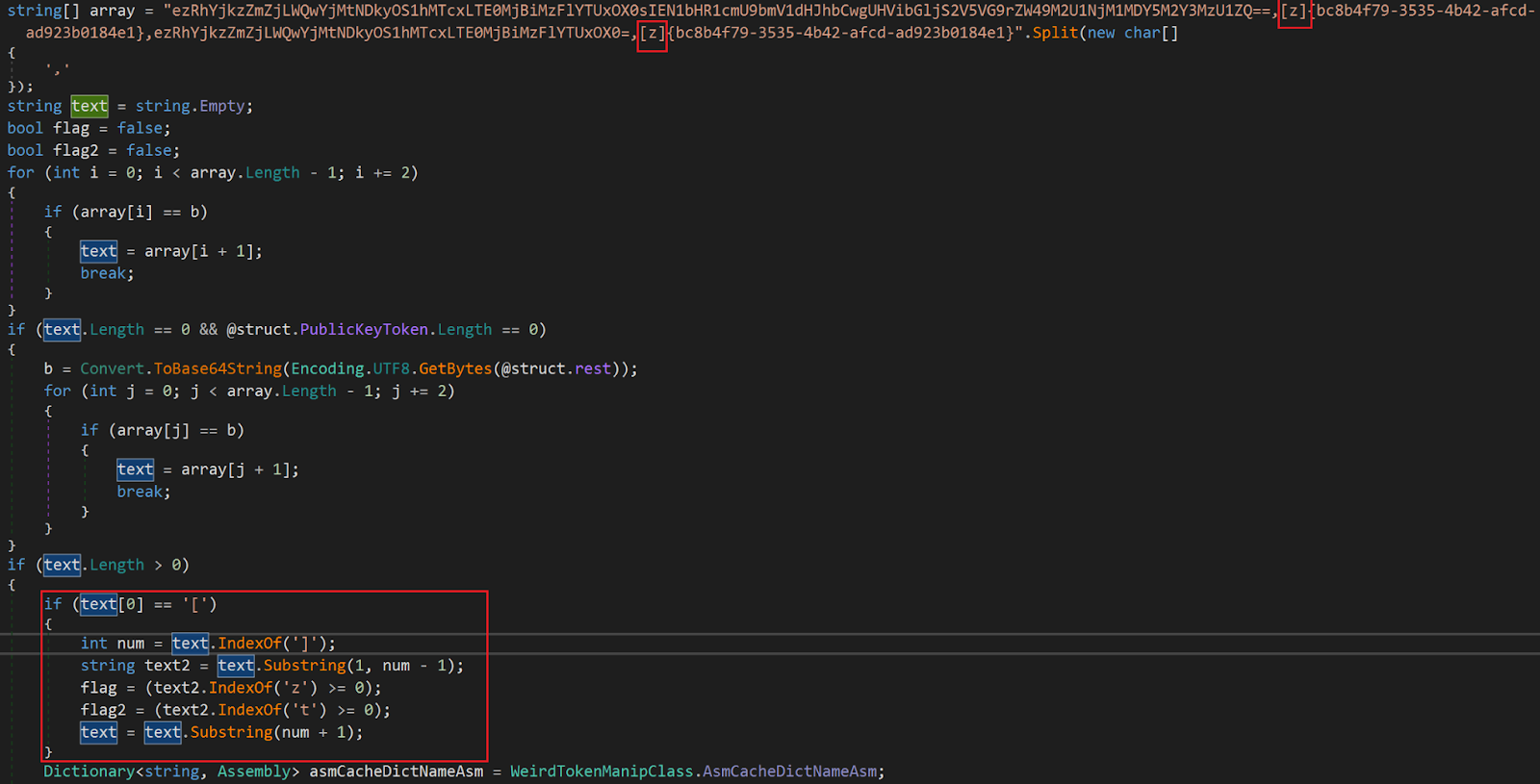As part of the SmartAssembly’s obfuscation, the module entrypoint first adds an assembly and a resource resolver. An extra assembly resolver is added to handle compressed and/or encrypted data. Basically, when an assembly is referenced the resolver will capture that event and try to load the assembly from its resources. The requested assembly name is checked against a list of hardcoded assembly tokens or names (Figure 4).