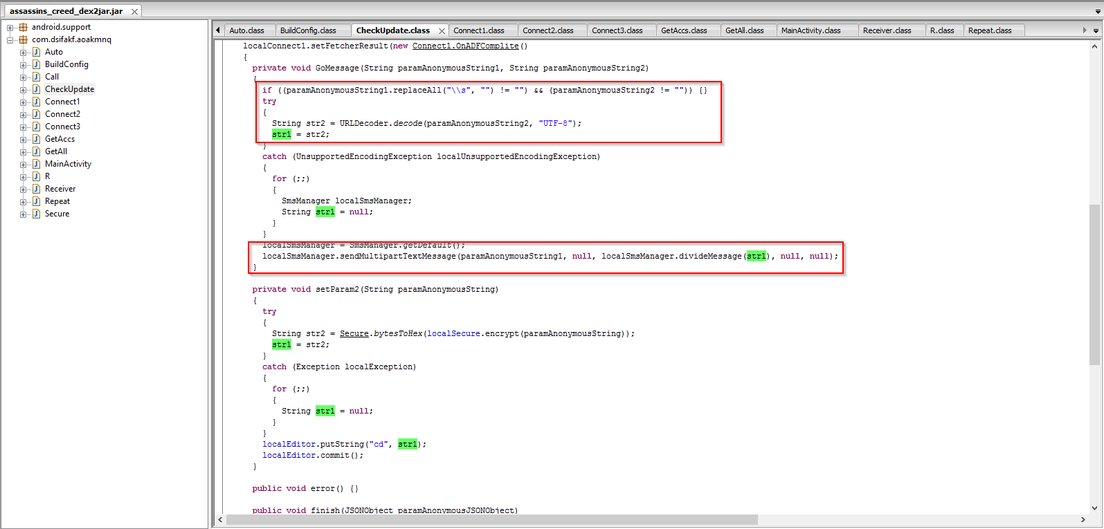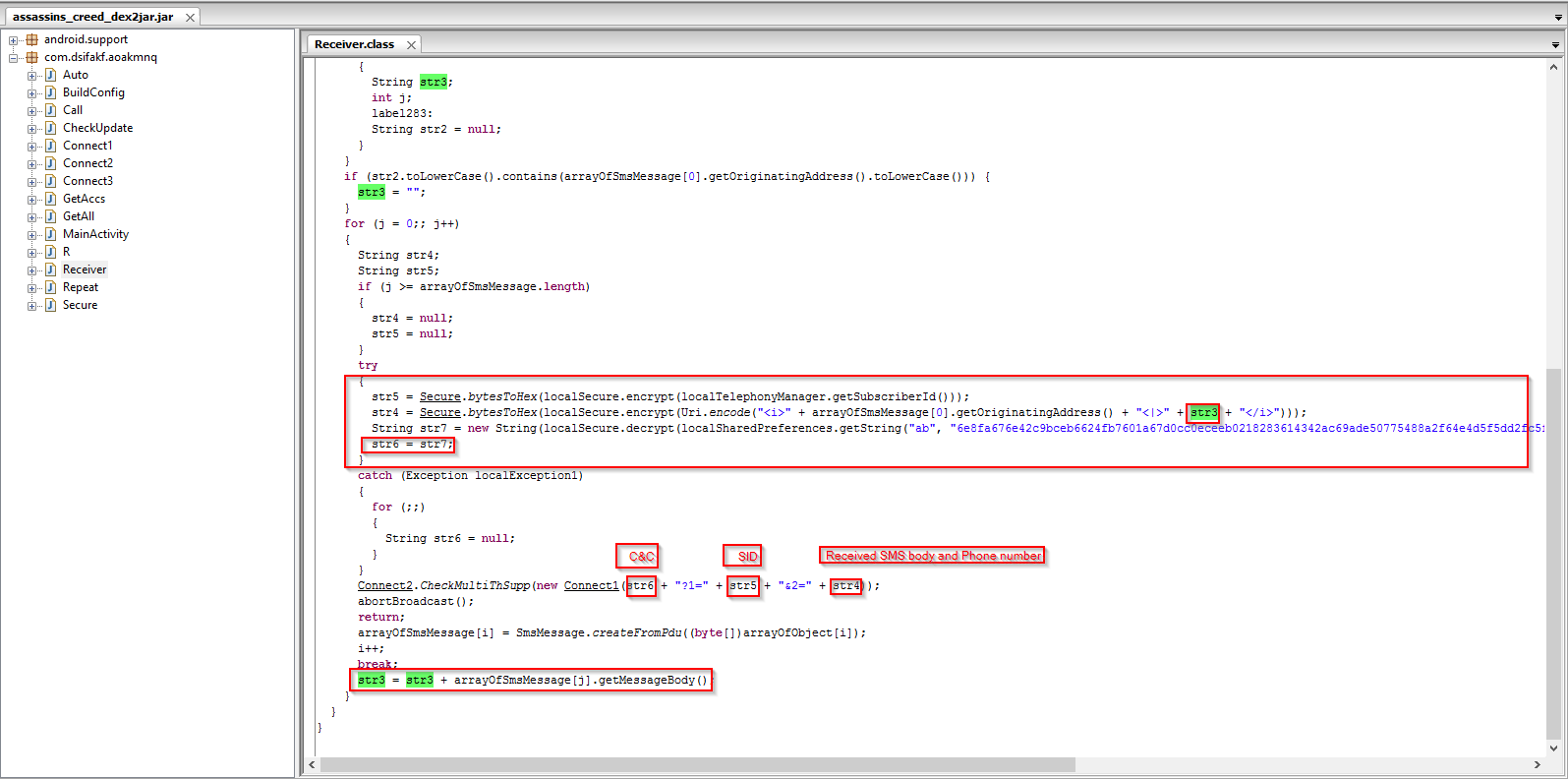 The malicious application is capable of sending multi-part text messages, harvesting text messages from a victim's device, and sending stolen information to a remote Command & Control (C2) server. We were able to locate phone numbers belonging to Russian bank "Volga-Vyatka Bank of Sberbank of Russia" in the malicious application code for which SMS messages are being intercepted to steal sensitive information. Another interesting feature we saw is the usage of AES encryption for all the C2 communication. It also harvests the mobile number and Subscriber ID information from the victim device for tracking purposes.