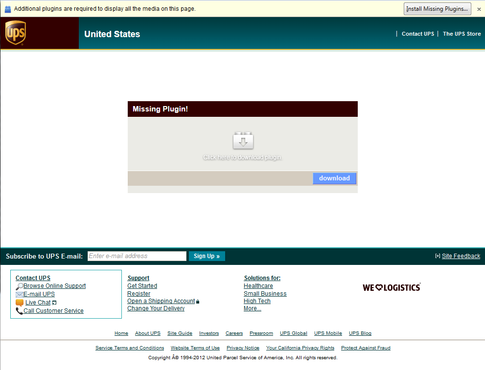 The page is located at hxxp://www.retinamac.ru/UPS/. It has been up for at least three weeks and not yet blocked by Google Safe Browsing. At the top is a fake Firefox warning bar (the same type we analyzed earlier) for a missing plugin. It is interesting to note that the page shows the same fake bar to all browsers - it does not attempt to fake a specific implementation for say Internet Explorer or Chrome.