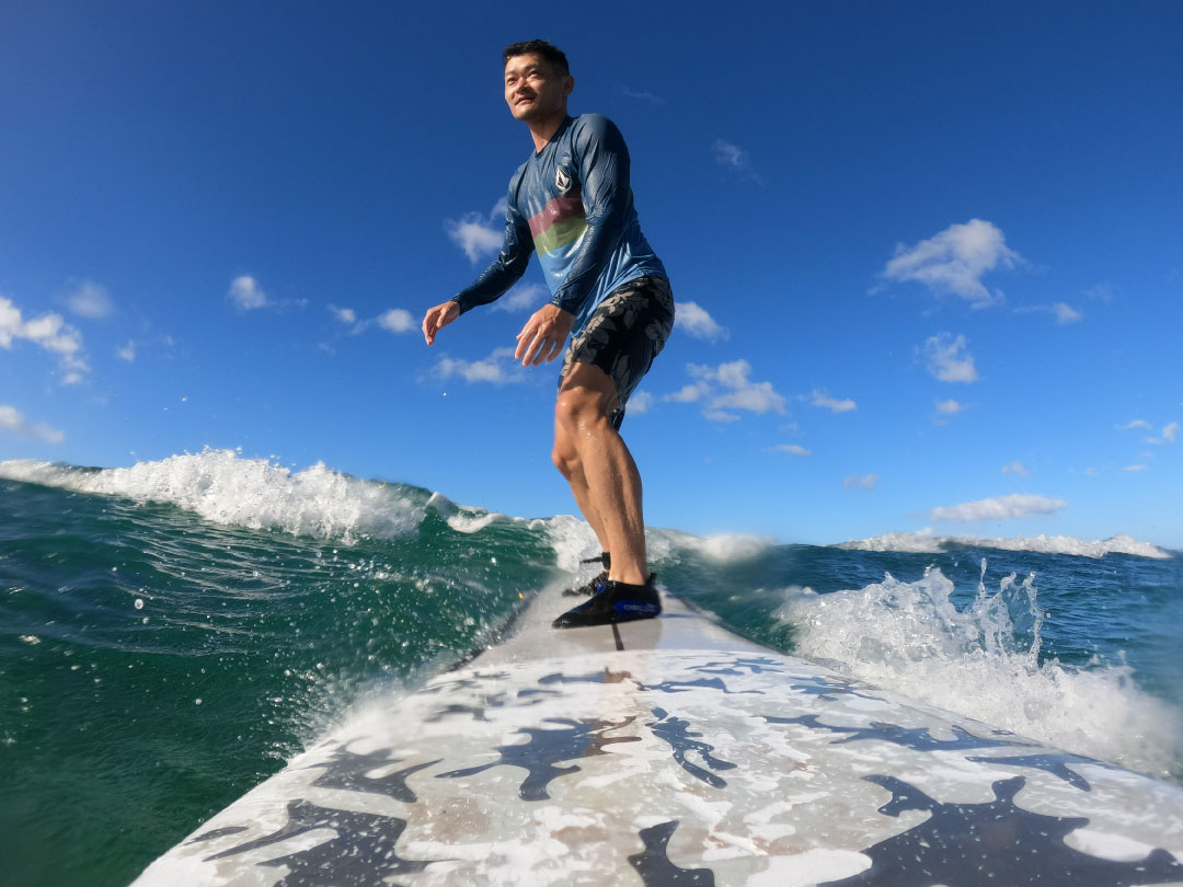 プライベートでは旅をすることや自然の中で過ごす時間が好きで、運動も楽しんでいます。年に数回ですが、ゆるくロングボードを楽しむのが私のリフレッシュ方法です。