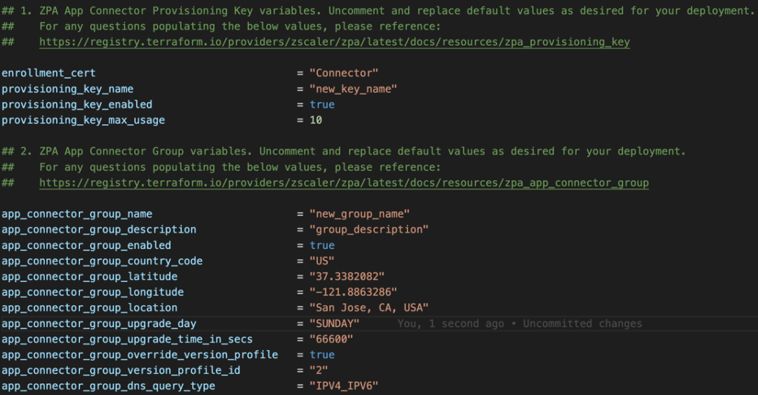 1. By default, this module creates a new App Connector Group as well as a new Provisioning Key, which is deployed by the Zscaler Private Access Terraform Provider. The below example shows the variable input values to create these 2 constructs in the ZPA Cloud.
