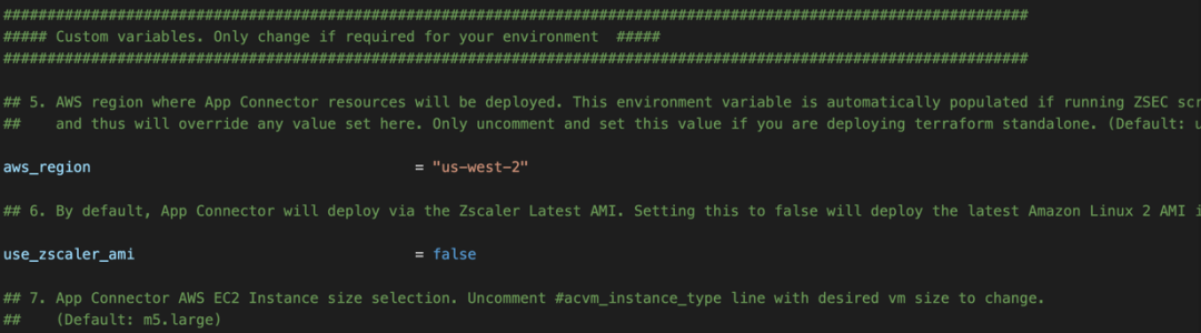 1. Here you can choose your specific region as well as the AMI type to be used. By default, this module will deploy an App Connector using the Zscaler marketplace AMI; however, you can also choose to deploy the ZPA App Connector software in an Amazon Linux 2 instance by setting the variable use_zscaler_ami = false.