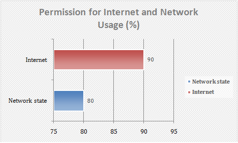 Form our data, we have seen that 90% of apps are requesting Internet access and 80% of apps are requesting network discovery permissions, which allow the app to determine the user’s cellular network connectivity, such as whether the user is using 3G or 2G etc.
