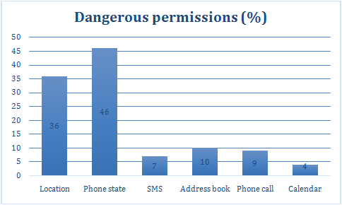 From the graph, you can see that of the 75K+ Android apps analyzed, 36% of the apps request location permissions. 46% of apps are asking for the phone's state permission, which allows apps to access your SIM card information, IMEI number etc. 7% of apps are requesting SMS permissions, 10% request access to a user’s address book and 4% request access to the calendar.
