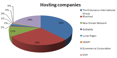 The Endurance International Group, which owns 20 hosting companies (iPowerWeb, Pow Web, Dot5 Hosting, StartLogic, Fatcow, Globat, etc.) hosts 38% of the hijacked sites. Bluehost, a rather small hosting provider, represents 28% of the hijacked sites. However, the biggest providers host a small proportion of sites used for malicious spamming: 2% for GoDaddy, and less than 0.5% for 1&1.