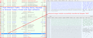 Following succesful exploitation, we have seen Dofoil being installed. The screenshot below shows its signature pattern of decoy GET and POST requests to URLs in the browser history with a few actual callbacks mixed in. The command & control server even uses 404 error codes to attempt to mask the nature of the callback activity.