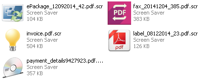 Lets take a look at the files after unzipping them. All of the files are Windows screen savers and include fake icons of legitimate software packages, to persuade the victims to click on them.