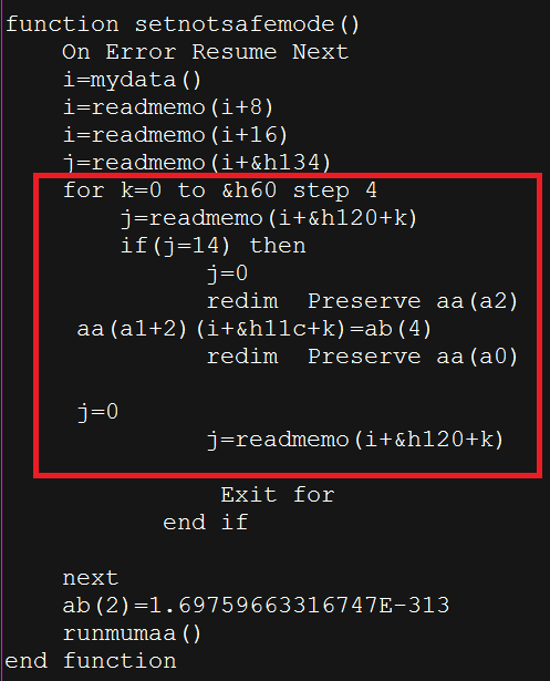 If the IE version used by the victim is lower than 4, the runshellcode() routine will be invoked, skipping the CVE-2014-6332 exploit cycle.  If the version used is higher than 3, setnotsafemode() routine is invoked to exploit the CVE-2014-6332 vulnerability.