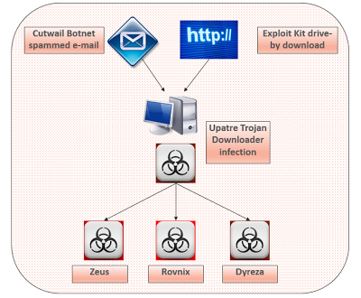 Upon successful infection, Upatre has been responsible for downloading malicious payloads from known malware families such as:
