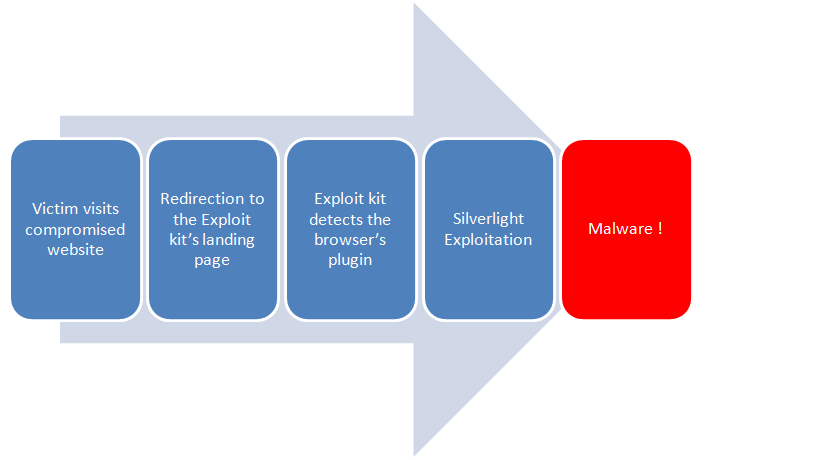 The following is a typical infection cycle involving Silverlight exploits in EKs: