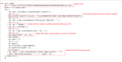 The exploit takes advantage of vulnerable ActiveX object “RDS.DataControl” having classid “BD96C556-65A3-11D0-983A-00C04FC29E36”. The exploit is designed to download executable files, which are then stored on victim's machine. This executable file path in the exploit is as follows: