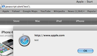 ImageIn this example on Safari, I was initially on the www.apple.com page before I launched the JS in my URL bar - so you can see the Apple page in the background and the JS alert message appears to have come from www.apple.com. This would change depending on whatever page I was on when I launched the JS in the URL bar - additionally the JS could be modified to interact with or modify content on the current page. In other words, you could run JS that could completely modify the Apple page locally in your browser or interact with buttons or links. This is an important concept to understand and is a technique that is being used to do damage to Facebook accounts / profiles.