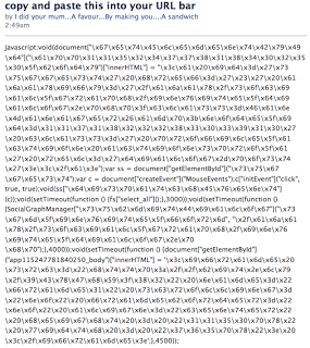 The most common case, are Facebook groups that ask you to join and then enter in some JS into your URL bar. For example,