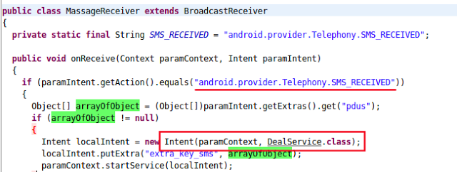 DealService's task is to get the SMS messages from receiver and send it across to the C&C server. It starts an Asynchronous task (AsyncTask, as shown in screenshot below) which then forwards the messages to C&C server in the form of POST request.