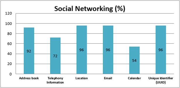 In the Social Networking category, 92% of apps use address book functionality, 72% of apps are asking for telephony information, 96% of apps are using location APIs and the Email framework, while 54% of apps are accessing calendar functionality and 96% of apps track via UUIDs.