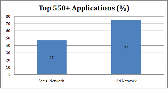 Below we see the percentage of applications which are trying to use social media and ad networks.