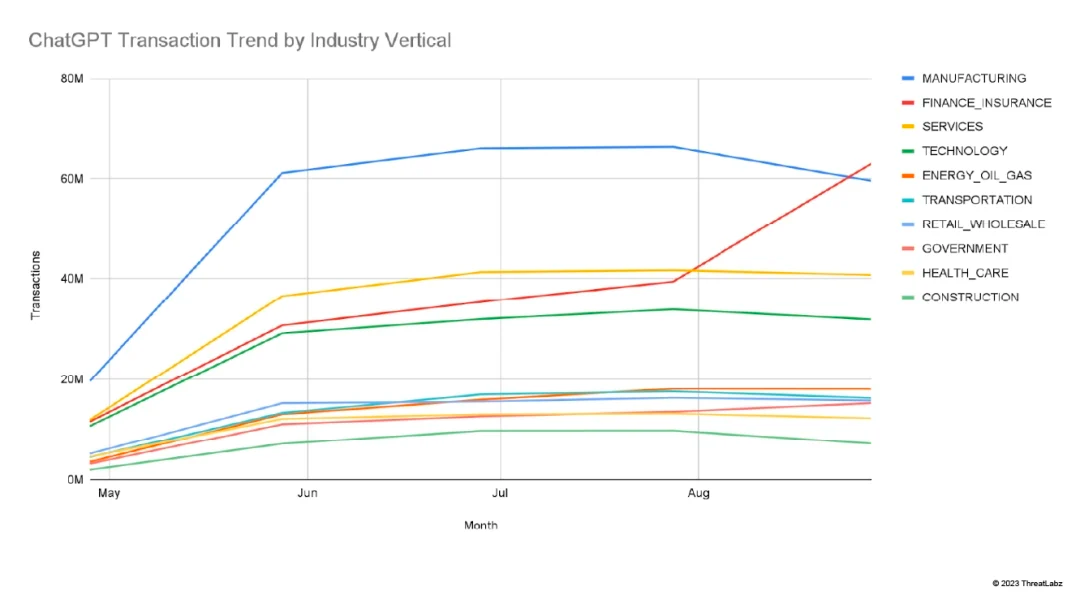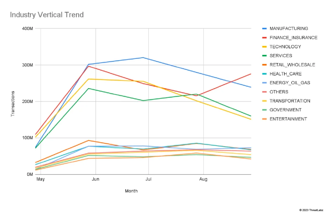Our research shows that, mirroring the broader AI trend, enterprises across industry verticals sharply increased their use of AI from May 2023 to June 2023, with sustained growth through August 2023. We see that the majority of AI/ML traffic is being driven by manufacturing, which may offer a glimpse into the rapid innovation and transformation driven by Industry 4.0. Indeed, its substantial engagement in these tools highlights the likely key role that AI and ML will play in the future of manufacturing.