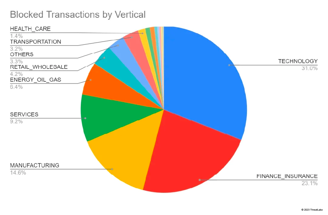 Our research also found that as enterprises adopt AI/ML tools, subsequent transactions undergo significant scrutiny. Overall, 10% of AI/ML-related transactions are blocked across the Zscaler cloud using URL filtering policies. Here, the technology and finance industries are leading the charge, accounting for more than half of blocked transactions. Interestingly, Drift holds the distinction of being the most blocked, as well as most used, AI application. In all likelihood, we will see other industries take their lead to ensure that enterprises can minimize the risks associated with AI and ML tools.